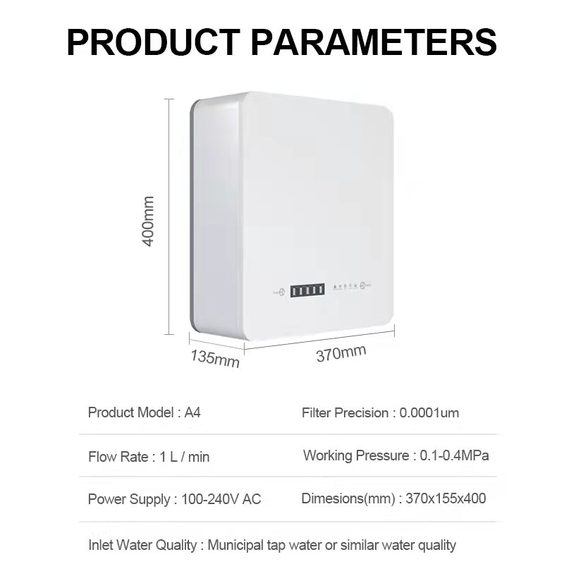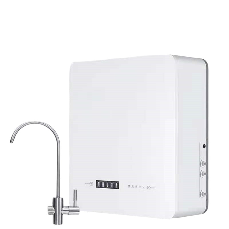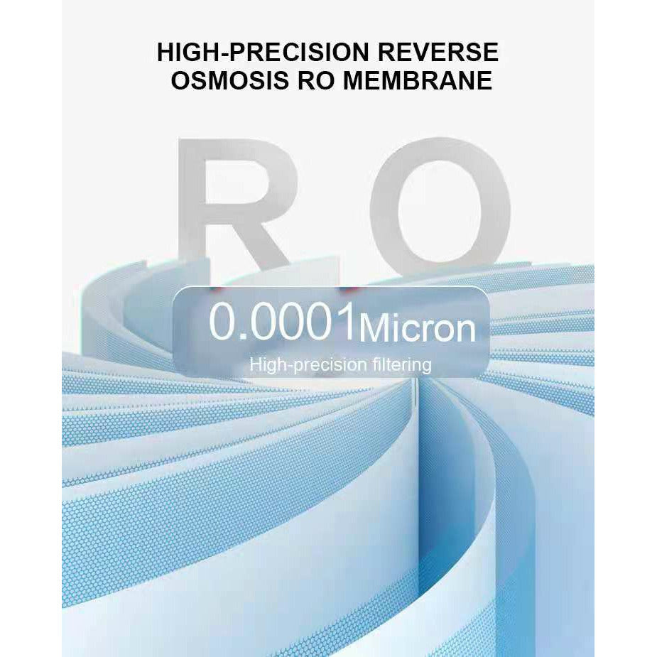 4th stage (reverse osmosis membrane): RO is a process through which water pressure pushes the tap water through a semi-permeable membrane that allows relatively small water molecules. Theory filtration accuracy of 0.0001µm, removal of bacteria, viruses, heavy metals, and other organic impurities in water. Filter replacement time 12-24 months;
