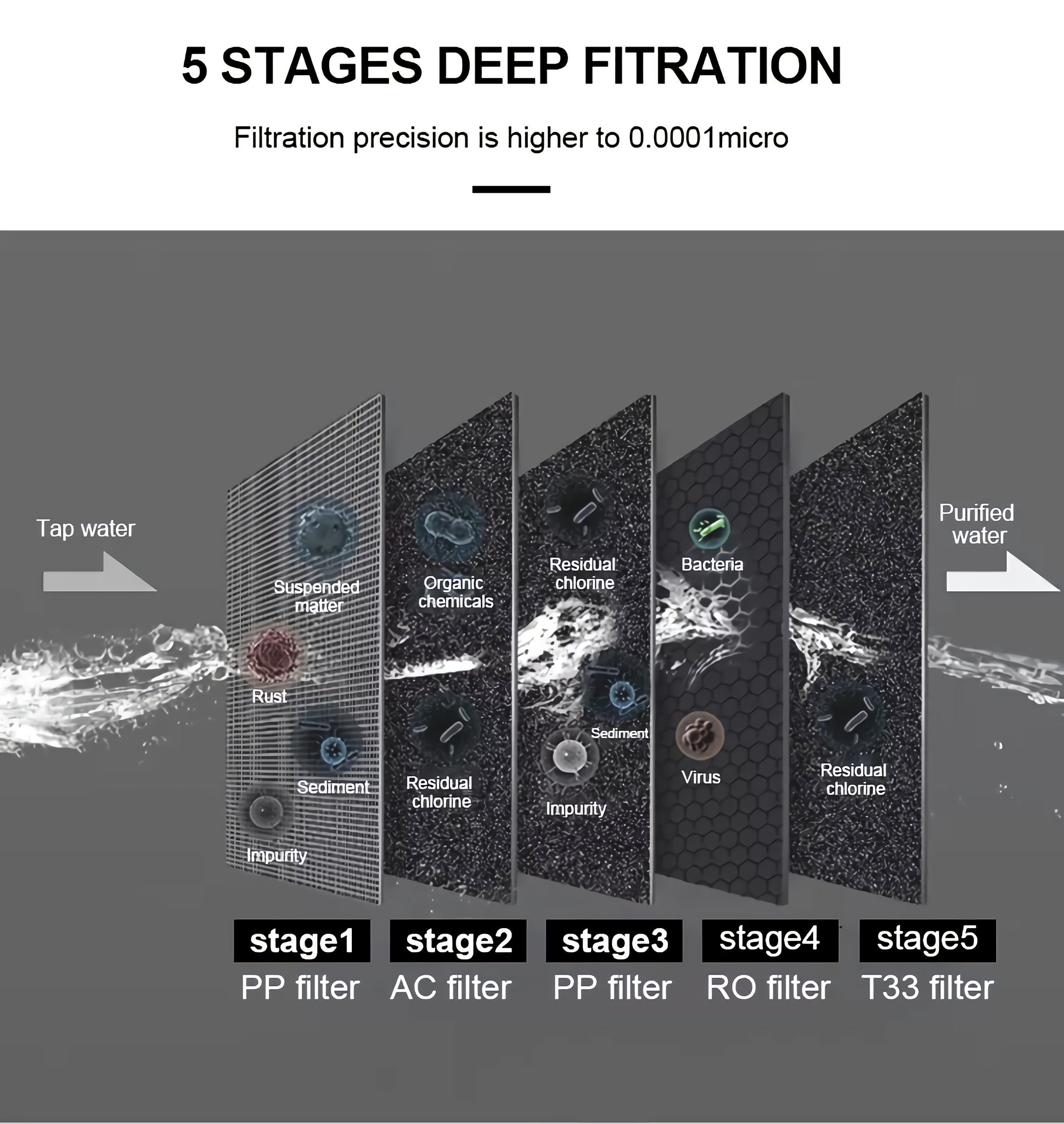 2nd stage (activated carbon filter element): adsorbs peculiar smells, heterochromism, organic matter, chlorine, pesticides, herbicides, nitrate, microplastics for example, Filter replacement time= 9-12 months;